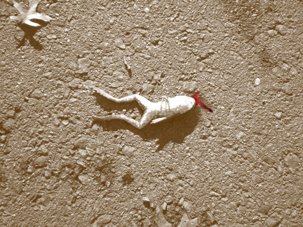 “I’m gonna throw it up in the air!” I announced with phony bravado, “it’ll land on this rock and SPLAT!” And before the skeptical muttering of the death squad could reach critical mass, I flung the frog as high into the air as I could and it came down on the rock. It didn’t go SPLAT and it didn’t go THUD, rather some hybrid of the two. SPLUD. It was on it’s back, white underbelly reflecting brightly in the early afternoon sun. Its splayed back legs twitched a few times and a delicate thread of scarlet blood trickled from its mouth.